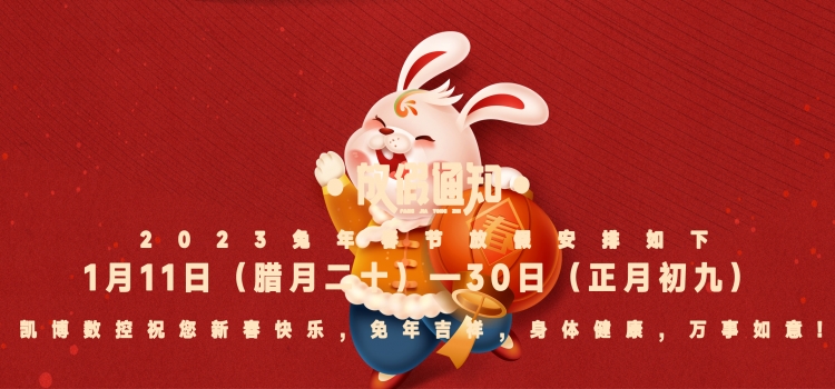 凱博數(shù)控2023兔年春假放假安排如下:2023年1月11日 (臘月二十) 一30日 (正月初九)凱博數(shù)控祝您新春快樂,免年吉祥,身體健康,萬事如意!